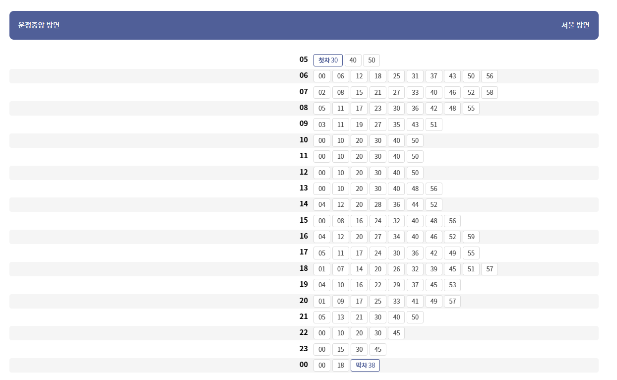 평일 및 주말 운행 시간표 기준으로 정리하면 다음과 같습니다.