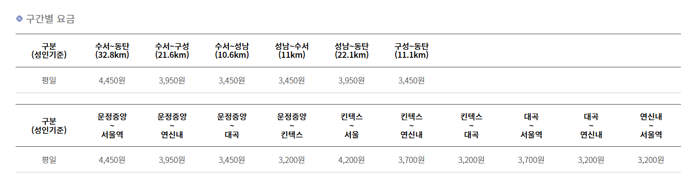 | 수서 ~ 성남 | 10.6km | 3,450원 |