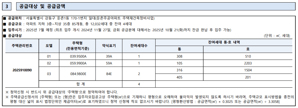 | 주택형 | 전용 면적 | 면적동/호수 | 공급가(만 원) | 비고 |
