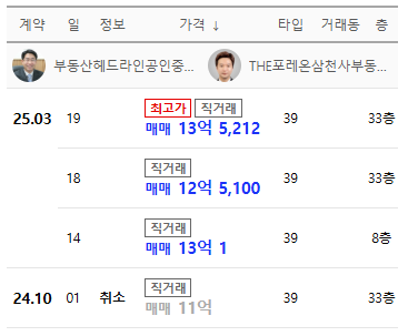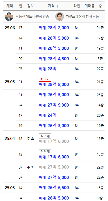 | 타입 | 분양가(만 원) | 실거래가(최고/평균) | 호가(최고/평균) | 예상 시세차익 |